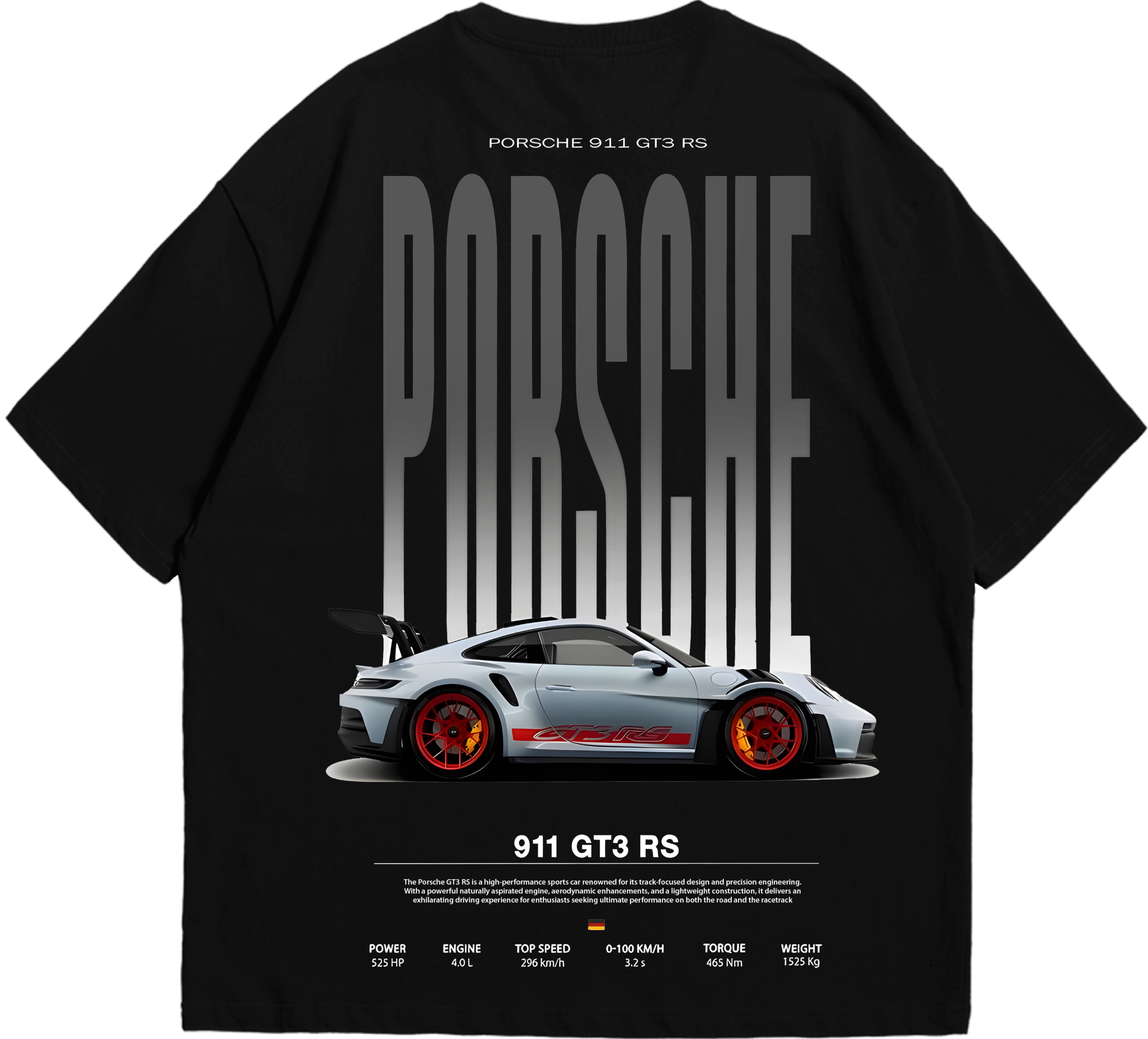 This isn’t just a t-shirt; it’s a tribute to engineering perfection: the iconic 911 GT3 RS, with its track-focused soul, massive swan-neck wing, and lightweight obsession delivering heart-stopping acceleration (0-100 km/h in 3.2 seconds) and mind-bending grip. The massive back print captures the essence – aggressive gradients, the legendary “PORSCHE” lettering, the silver-grey beast with blazing red wheels, and full specs that remind you why this car is untouchable: